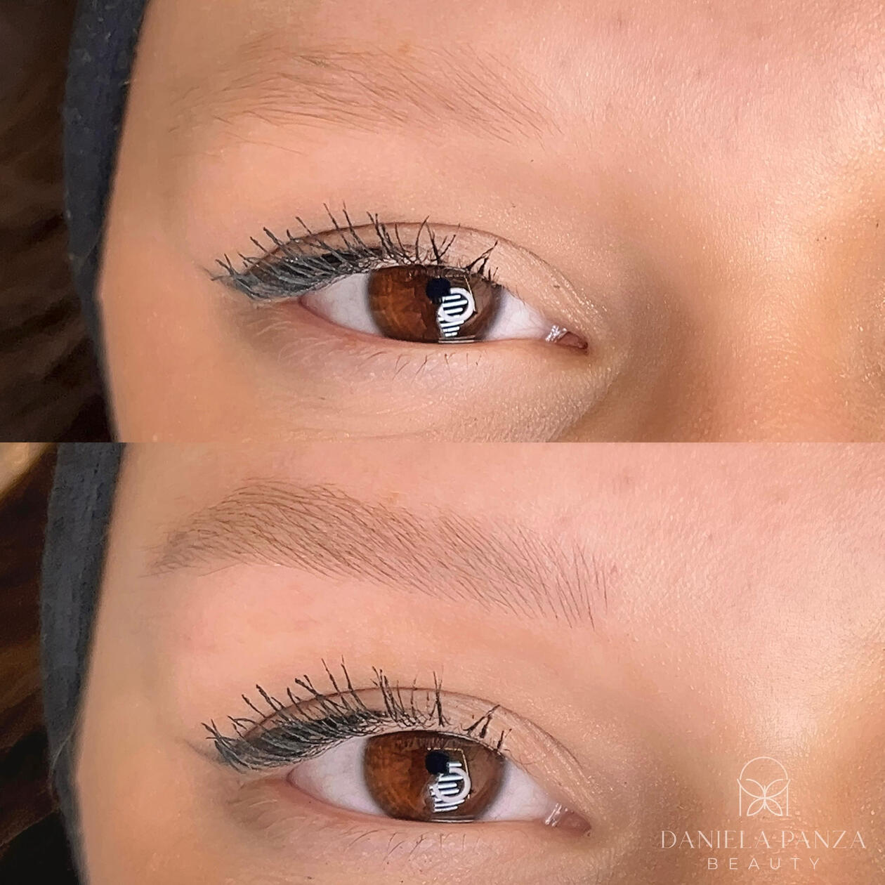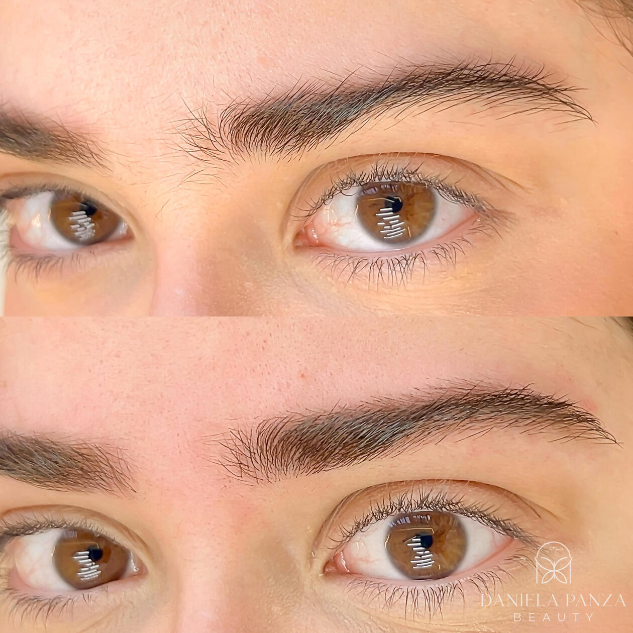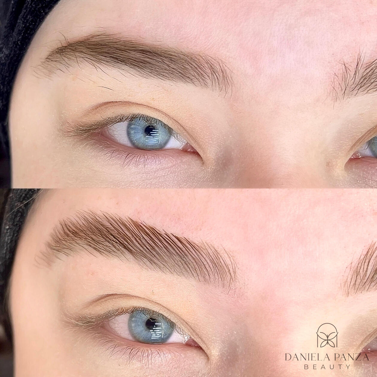 Técnica moderna e temporária de estilização das sobrancelhas que alinha e disciplina os fios, criando um visual mais preenchido e naturalmente definido.