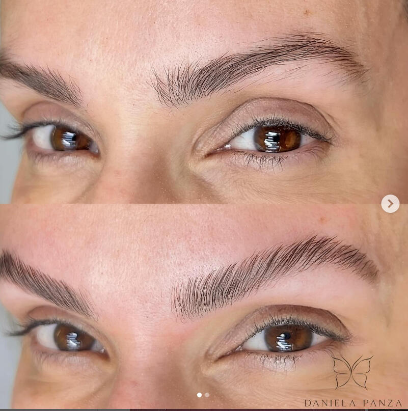 Técnica moderna e temporária de estilização das sobrancelhas que alinha e disciplina os fios, criando um visual mais preenchido e naturalmente definido.